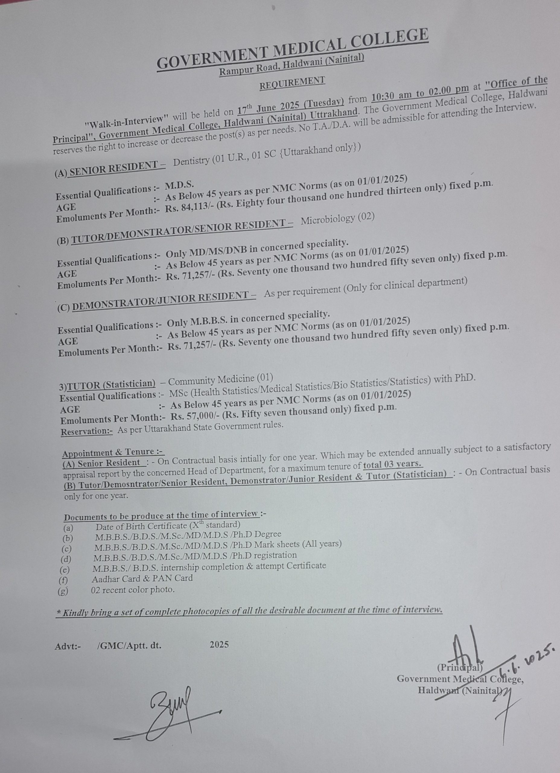 Walk in Interview for the post of Junior Residents in clinical departments only.